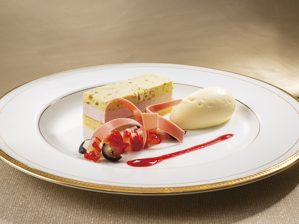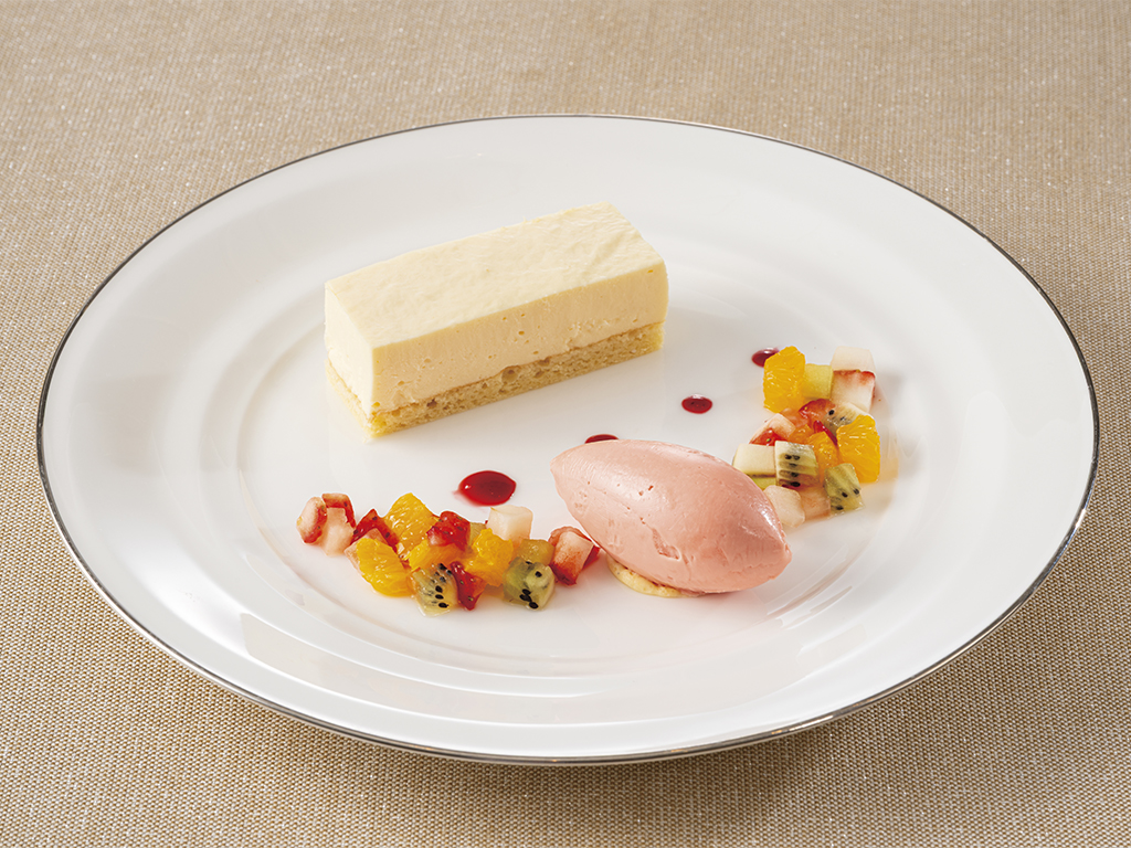 White chocolate mousse with seasonal fruits and strawberry ice cream