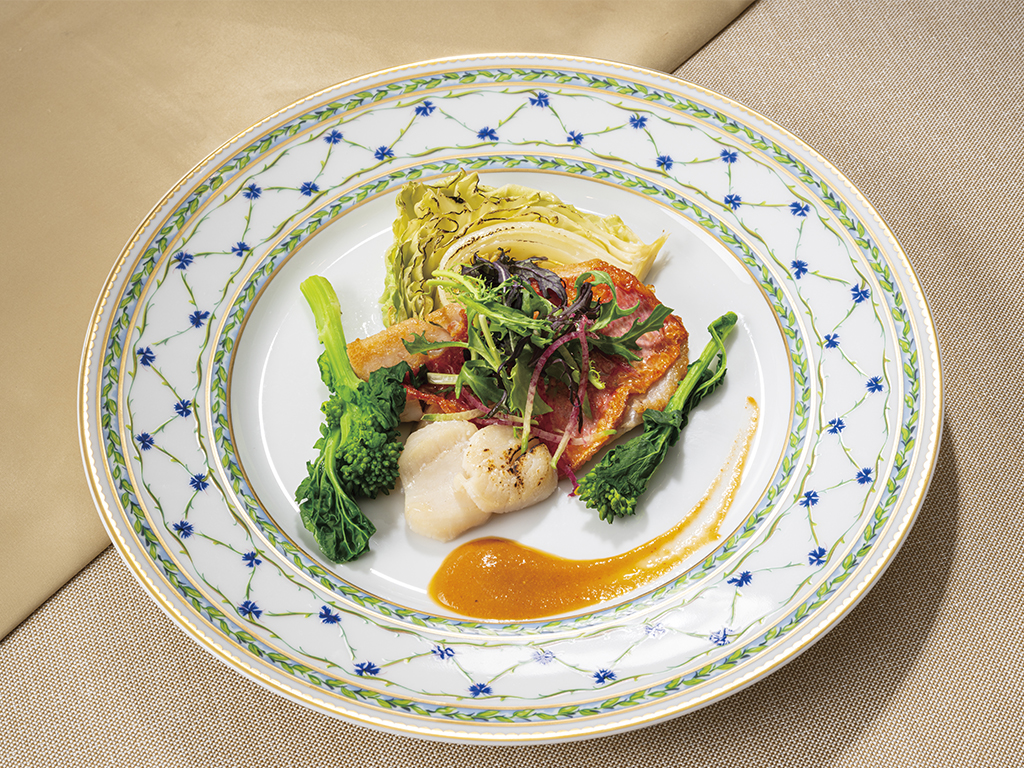 Poiret of sea bream and scallops with spring greens in bresse