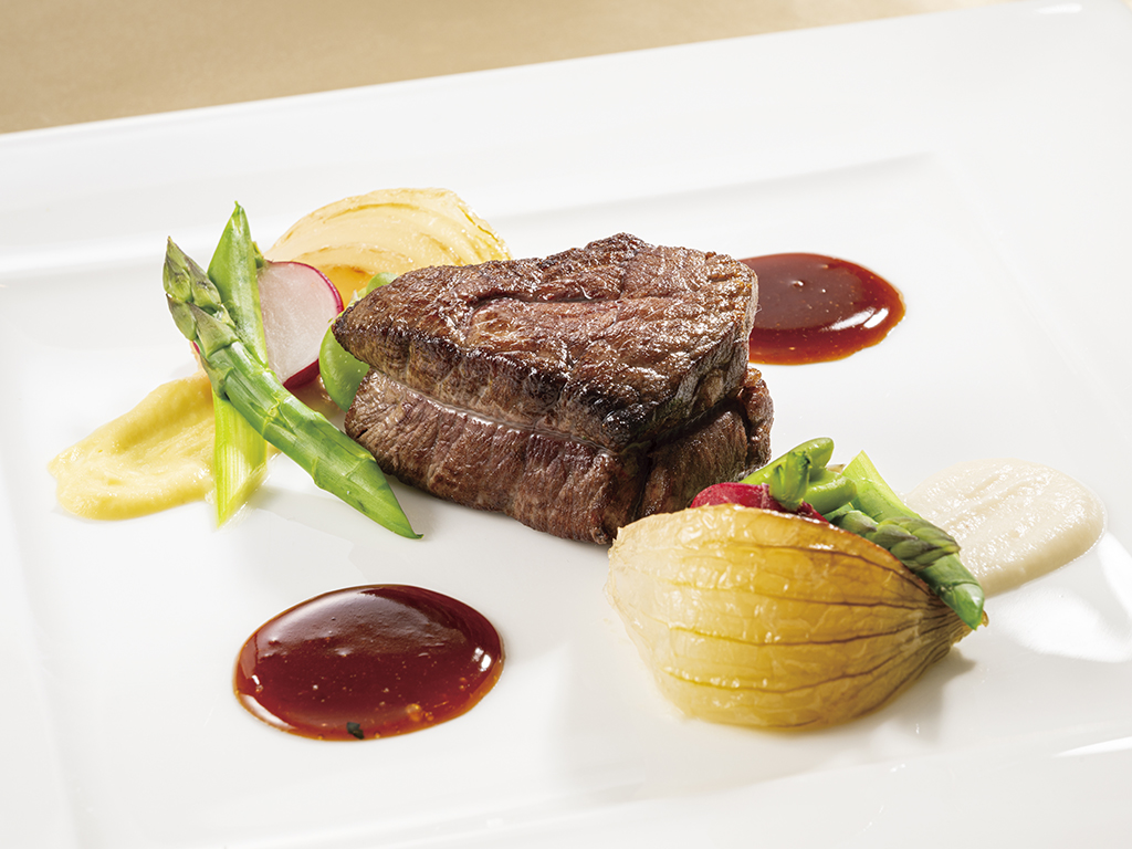 Poirette of Japanese beef fillet with celery rabe, yellow carrot puree and seasonal vegetables