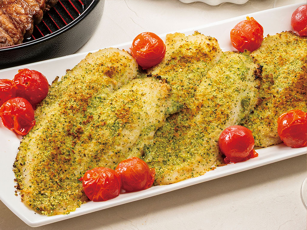 - 白魚用香草和蒜香番茄醬烤成薄餅
